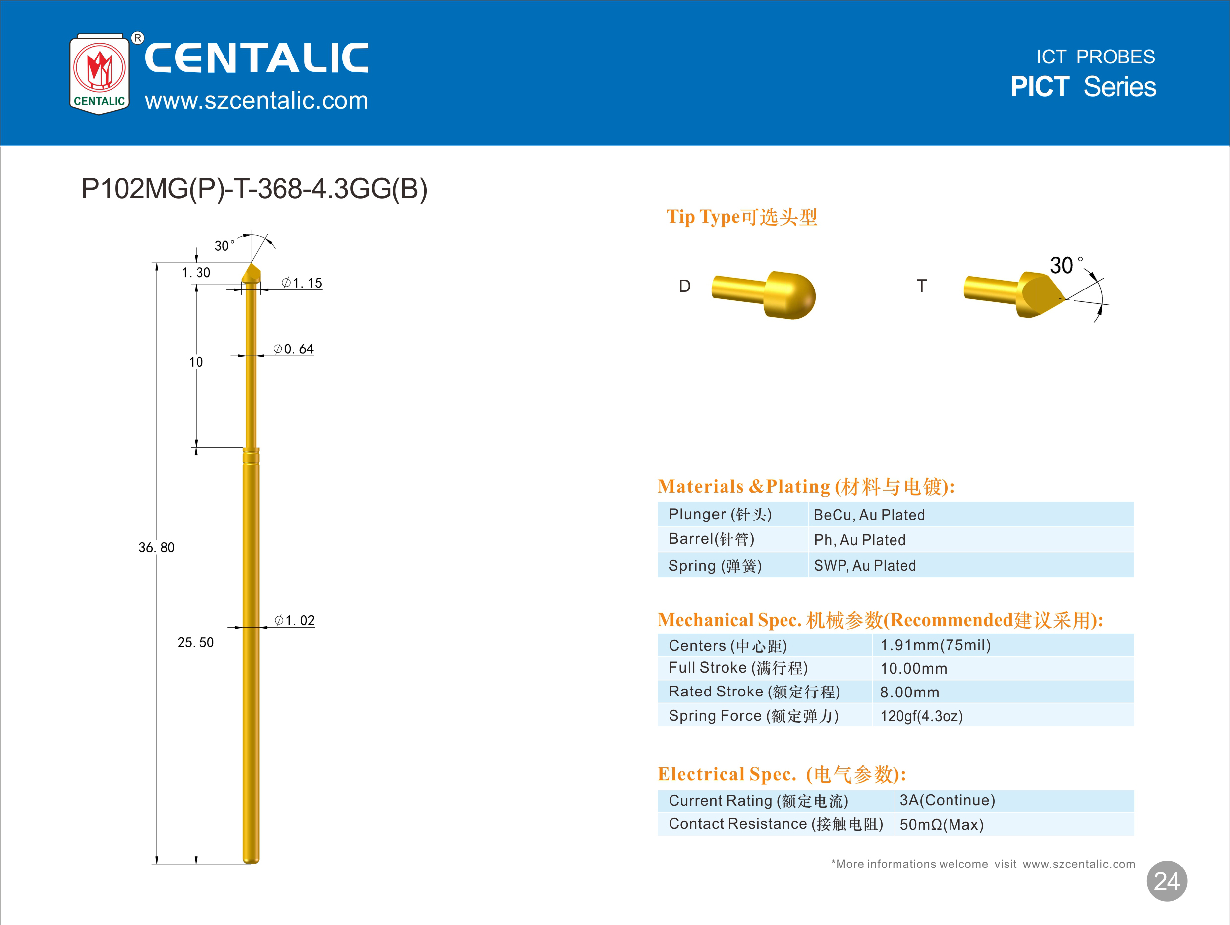 ICT testing needle, also known as "ICT online testing needle". Mainly used for online circuit testing and functional testing, detecting the electrical performance of online components on the board and the connection status of the circuit network, and being able to quantitatively measure and perform functional testing on the components.