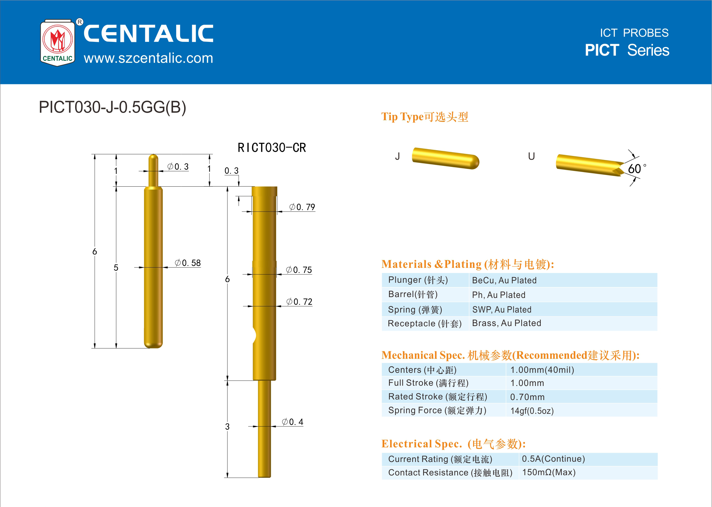 ICT testing needle, also known as "ICT online testing needle". Mainly used for online circuit testing and functional testing, detecting the electrical performance of online components on the board and the connection status of the circuit network, and being able to quantitatively measure and perform functional testing on the components.