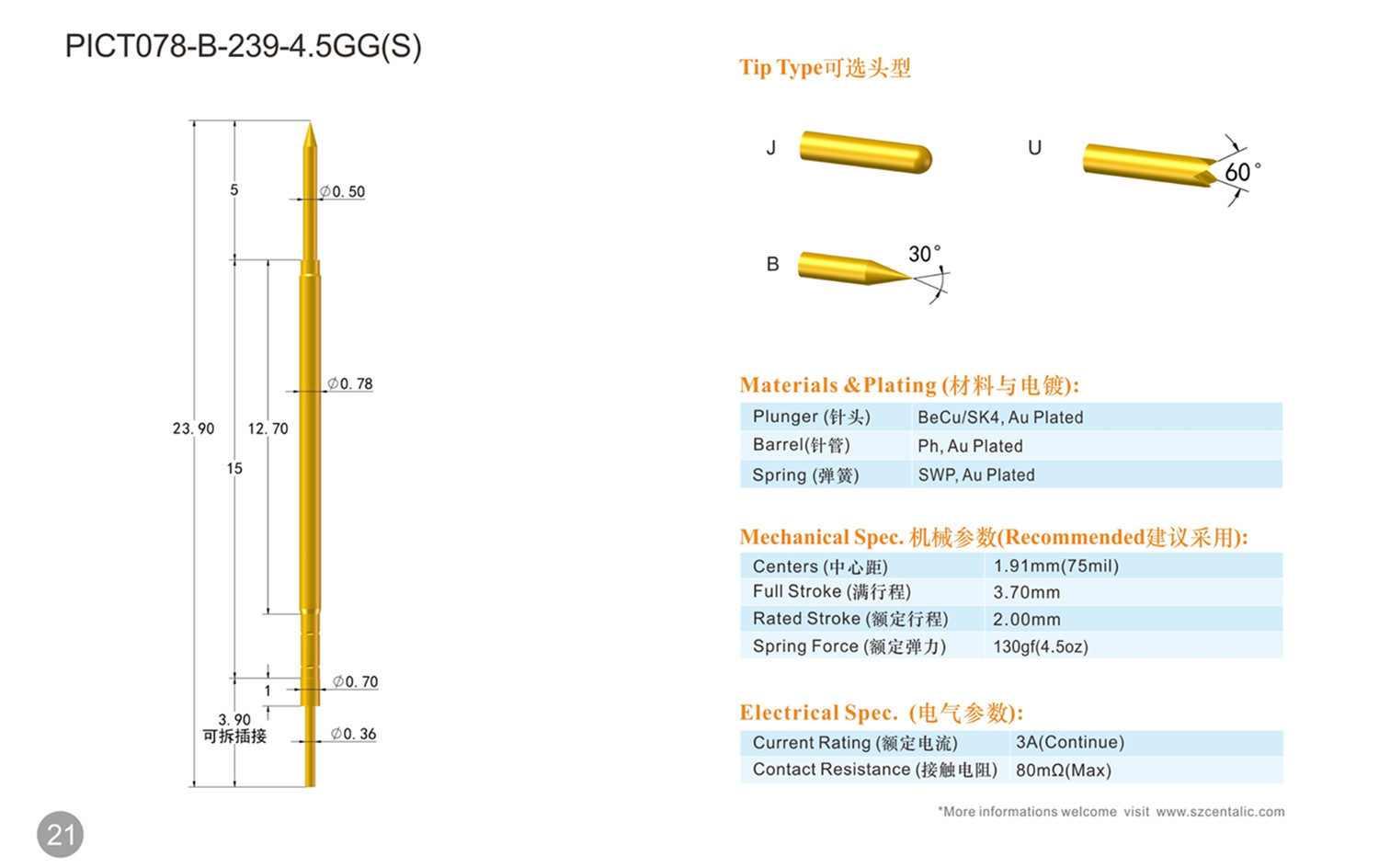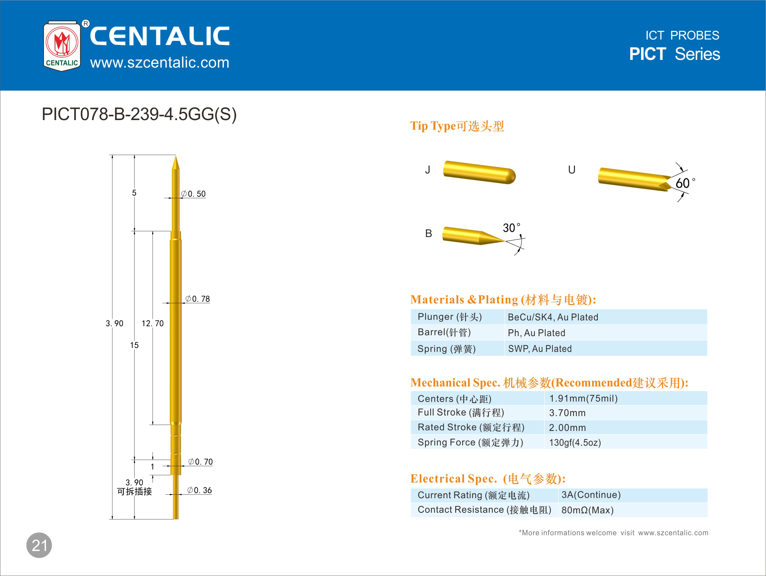 ICT testing needle, also known as "ICT online testing needle". Mainly used for online circuit testing and functional testing, detecting the electrical performance of online components on the board and the connection status of the circuit network, and being able to quantitatively measure and perform functional testing on the components.