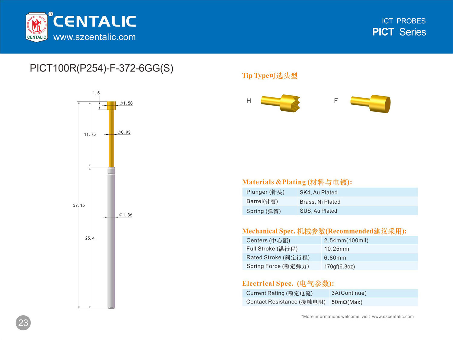 ICT testing needle, also known as "ICT online testing needle". Mainly used for online circuit testing and functional testing, detecting the electrical performance of online components on the board and the connection status of the circuit network, and being able to quantitatively measure and perform functional testing on the components.