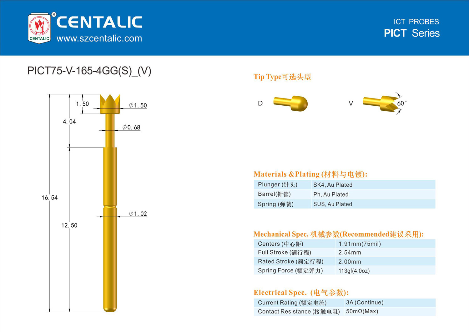 ICT testing needle, also known as "ICT online testing needle". Mainly used for online circuit testing and functional testing, detecting the electrical performance of online components on the board and the connection status of the circuit network, and being able to quantitatively measure and perform functional testing on the components.